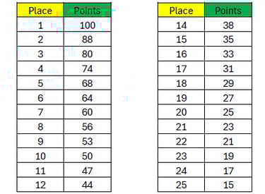 Ex: une équipe qui participe à 7 épreuves en se classant à chaque fois 10ème récoltera: => 7 x 50 pts + 60 pts bonus = 410